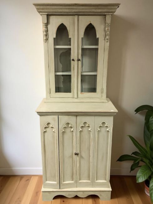 A 20th century painted pine bookcase in the gothic style, with glazed cabinet doors above and folding double doors beneath, 75 cm x 46 cm x 190 cm.
