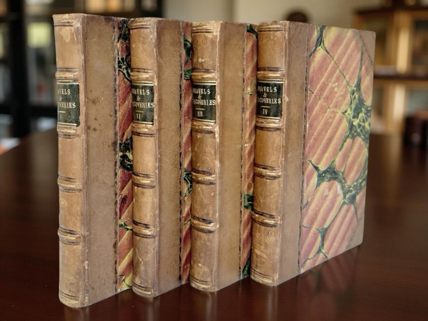 Denham, Major Dixon, Clapperton, Captain Hugh, and Oudney, The Late Doctor : Travels and Discoveries in Northern and Central Africa, in 1822, 1823, and 1824; with a short account of Clapperton's and Lander's Second Journey in 1825, 1826, and 1827, later pocket edition in four volumes, with ten plates and a folding map, publisher John Murray, London, 1831, frontis plate Sir Francis Lynch Blofse Bart., 32mo, half calf and marbled paper, black titles tooled in gilt, full marbled paper edge. (4)