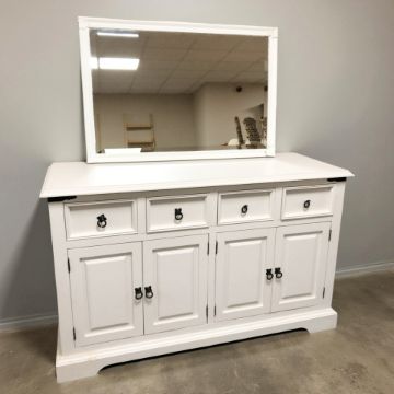 A modern painted pine sideboard, fitted cupboards and drawers beneath, 130 cm x 50 cm x 81 cm, together with a similar painted and bevelled mirror.
