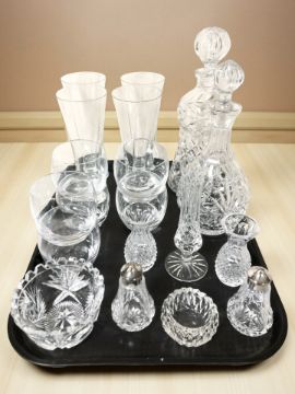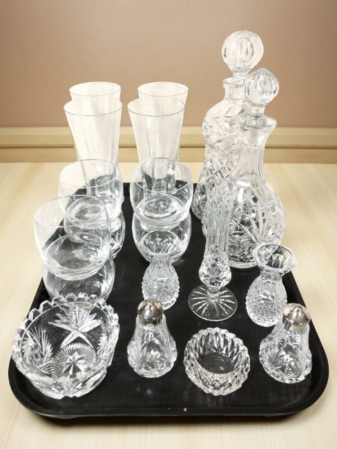 Assorted crystal drinking glasses, two decanters, sifters, an Edinburgh Crystal bud vase, etc.