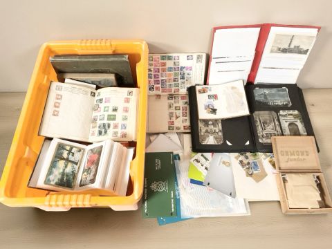 A collection of stamps, postcards, including antiquarian examples. (1 box)