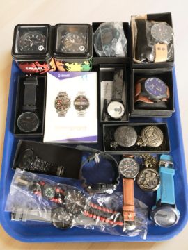 A collection of modern pocket watches, wristwatches, a smart watch, etc.