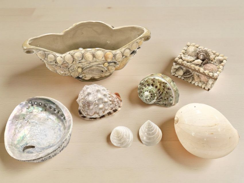 A group of decorative sea shells, shell covered trinket box and bowl.