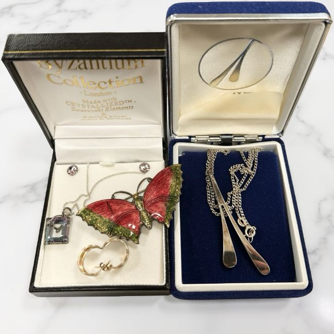 Hoop earrings 0.7g. Avon pendant and chain 12.8g.
