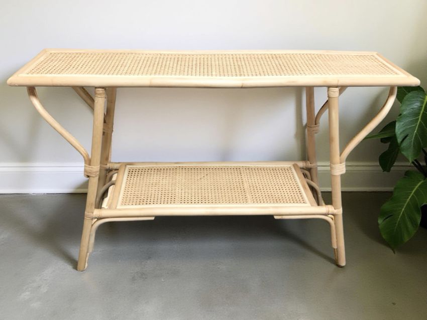 A bentwood bamboo and caned contemporary side table, width 125 cm.