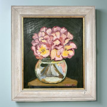 Stephanie P Dingle (1926-2017) Bowl of Roses, with the Manchester's Art House Gallery label verso, oil on board, 28 cm x 33 cm.