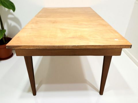 A 20th century teak extending dining table with internal leaf, unextended 152 cm x 84 cm x 72 cm.