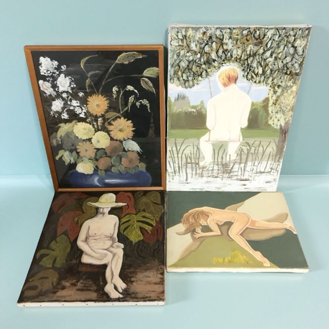 20th Century School : Nude figure seated in a garden, oil on canvas, 41 cm x 41 cm, together with two further similar nude studies and a still life of flowers in a vase.