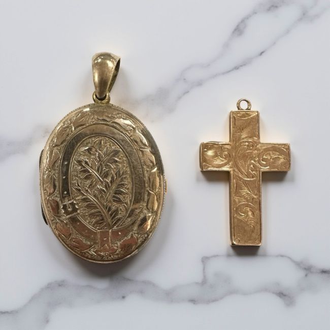 Crucifix indistinct marks 9ct, locket tested as around 9ct gold but not marked. Locket 5.9g, crucifix 1.3g.