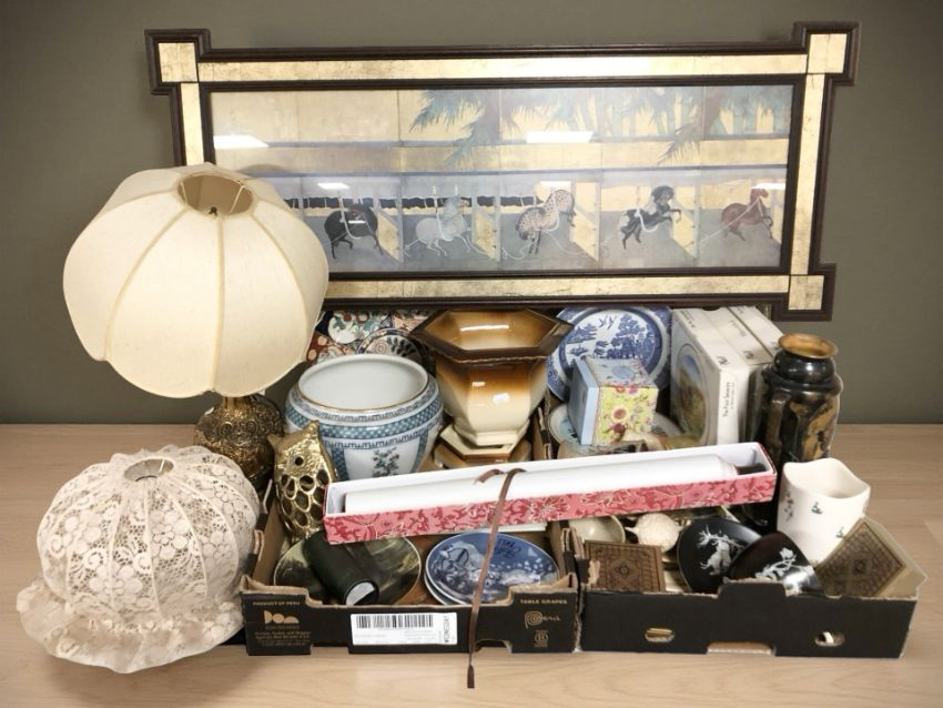 Assorted ceramics, table lamp, large print in gilt frame, etc. (2 boxes)