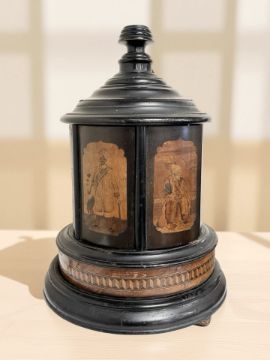 A late 19th century ebonised carousel cigar humidor, the revolving panels each inlaid with figures smoking from across the world, raised on bun feet, height 36.5 cm