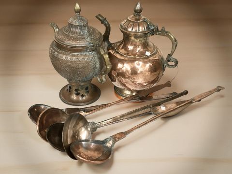 A 19th century copper kettle, a further heavily embossed brass copper kettle, and five ladles.
