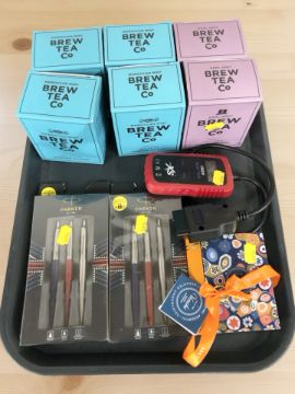 Two packs of Parker ballpoint pens, six boxes of Brew Tea Co. teabags, a vehicle fault code reader and a sealed tin of Venchi Italian chocolates.