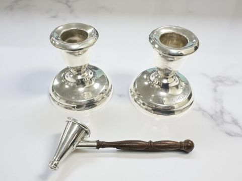 A pair of loaded-silver dwarf candlesticks, height 5.5cm, and a modern silver candle snuff. (3)