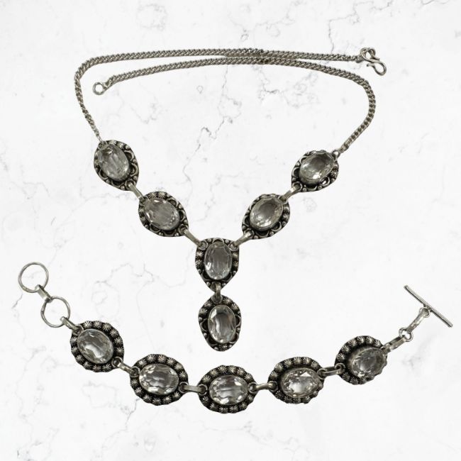 A Continental white metal bracelet set with crystal, mounted in Sterling silver, length 16 cm, together with the matching necklace.