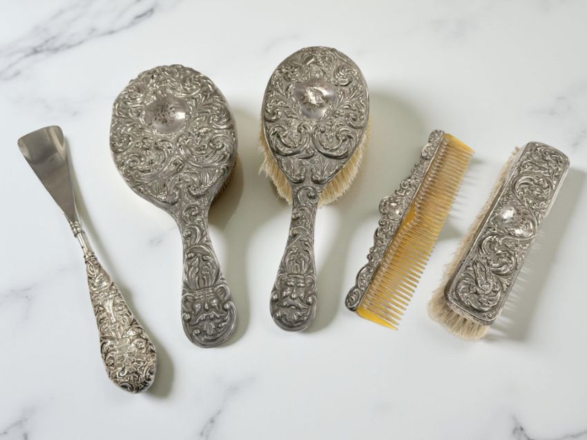 A Victorian silver-mounted five-piece dressing table set, John Harris, Birmingham 1898, longest 27cm.