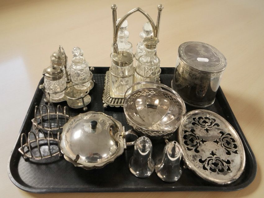 EPNS wares including a tea caddy, two cruets, a pair of toast racks, pair of sifters, etc.