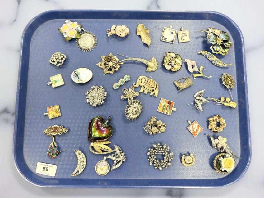 A group of costume jewellery, heart pendant, brooches, coin pendant etc