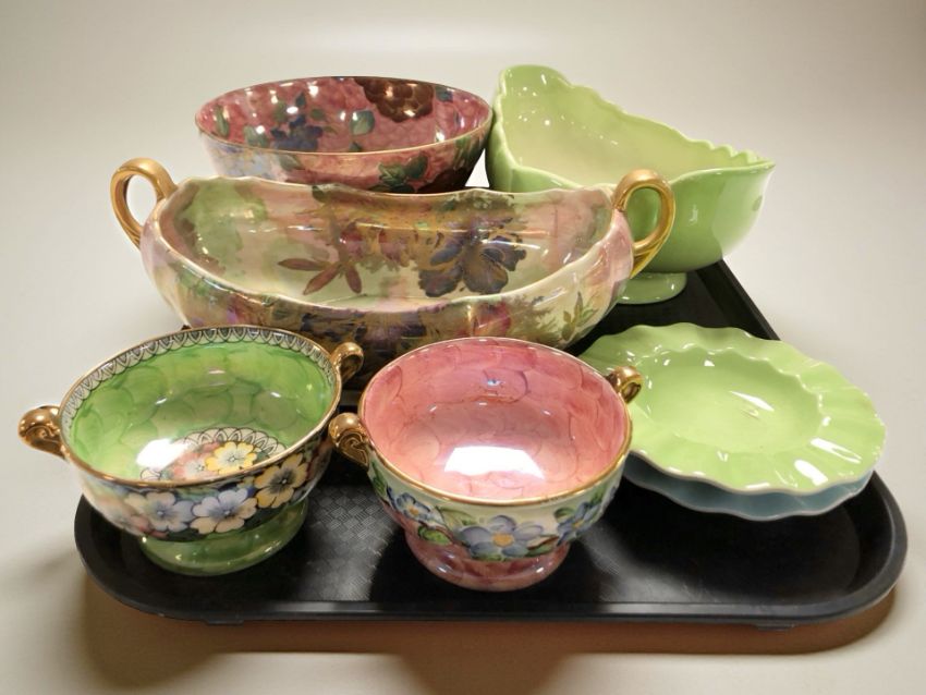 A group of Maling lustre wares including fruit bowls, twin handled bowls, ash trays, etc.