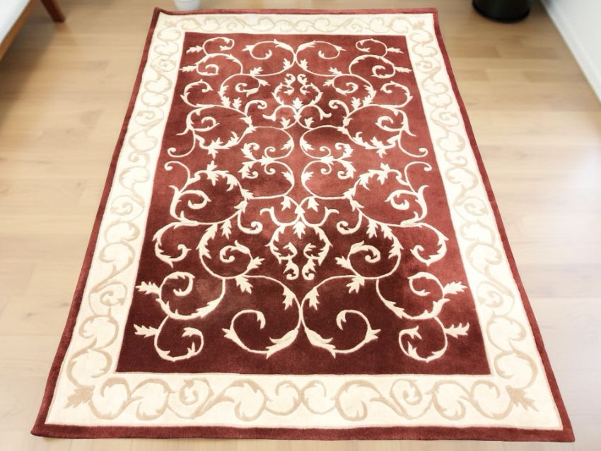 A machine-made rug on red and cream ground, 230 cm x 160 cm.