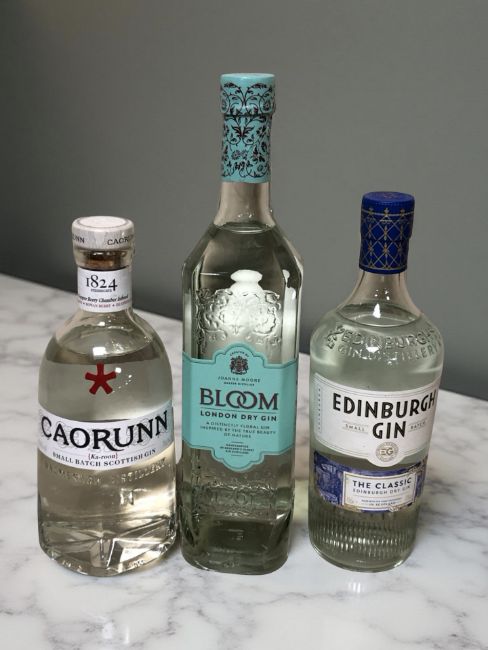 A 70 cl bottle of Edinburgh Classic Dry Gin, a 70 cl bottle of Caorunn Scottish Gin, and a 70 cl bottle of Bloom London Dry Gin