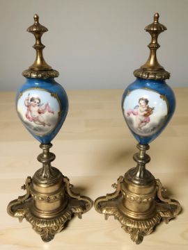 A pair of gilt metal mounted porcelain mantelpiece garnitures, height 30 cm.