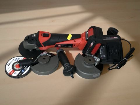 An Einhell cordless disk grinder and various fittings, charging stand