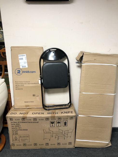 A Harbour Housewares black metal and PVC folding chair, plus another sealed in retail packaging, a further boxed four piece iron and rattan sofa set, and a boxed garden swing seat with canopy.