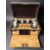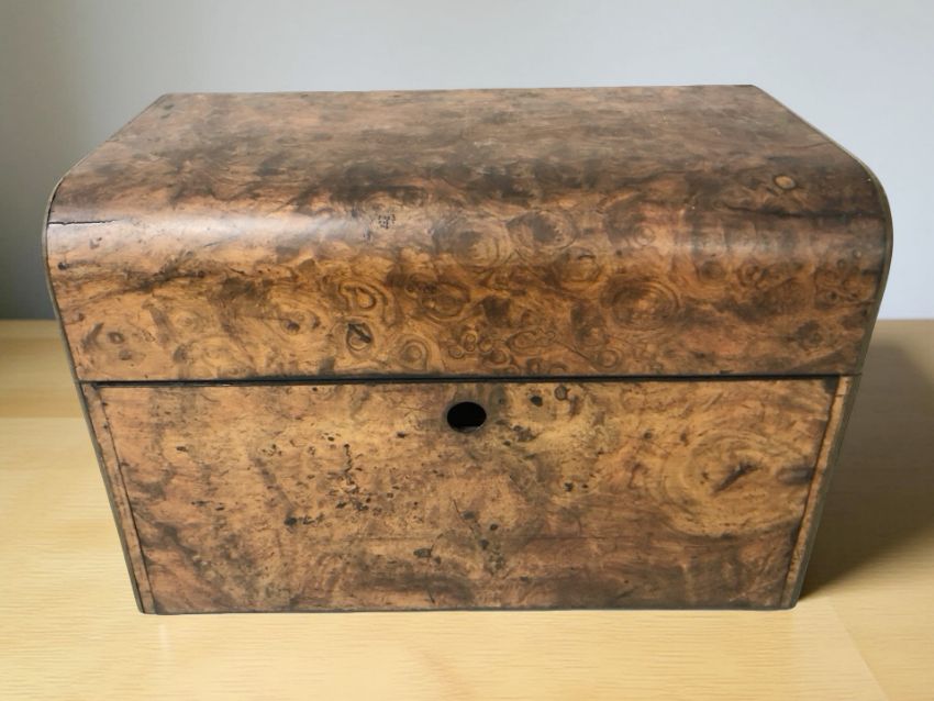 A burr walnut drinks box containing six pressed glass decanters, width 40 cm.