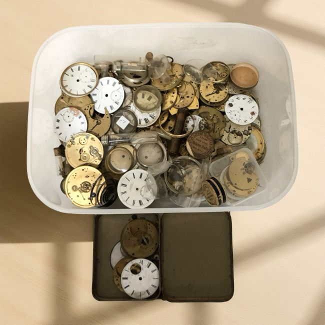 A collection of pocket watch movements, parts, dials, etc. (1 box)
