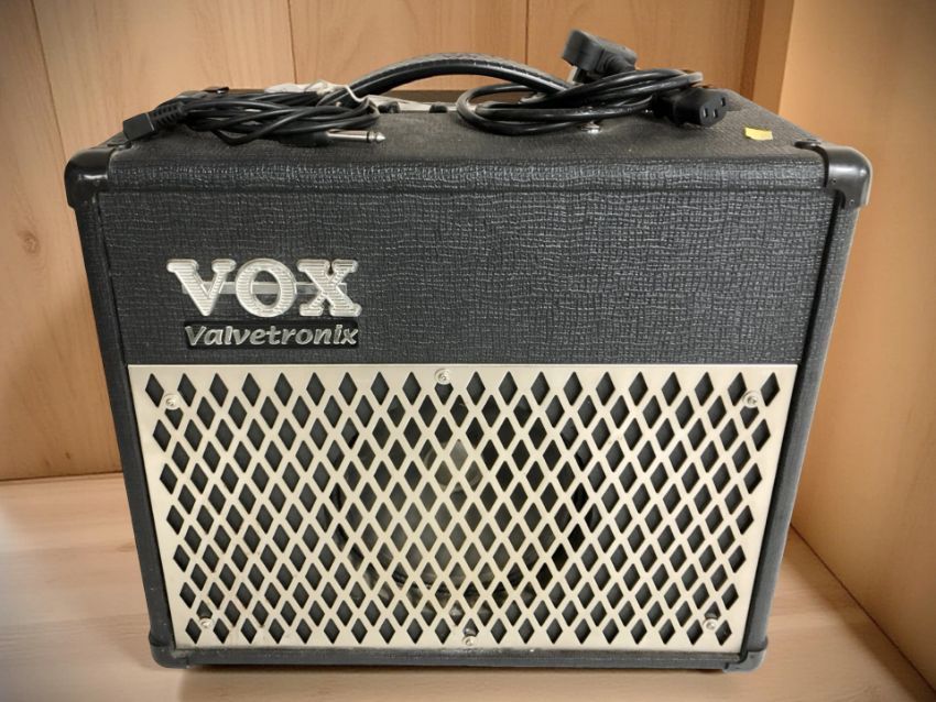 A Vox Valvetronix amplifier, with power lead and guitar lead.