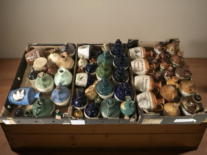 A collection of empty earthenware whisky jugs bearing various advertising. (3 boxes)