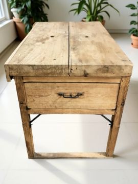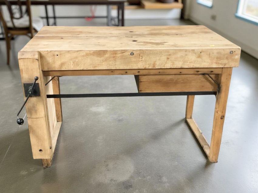 A contemporary reclaimed pine work bench / Butcher's block, fitted with a vice and drawer to one end, 130 cm x 77 cm x 85 cm.