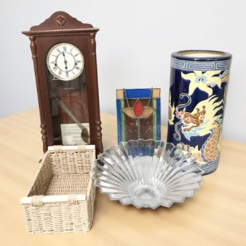 A large pottery stick stand, a stained glass panel, a glass fruit bowl, wicker basket and a modern wall clock. (1 box)