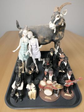 A group of contemporary jazz band figures, large ceramic figure of a goat and a further figure of two ladies.