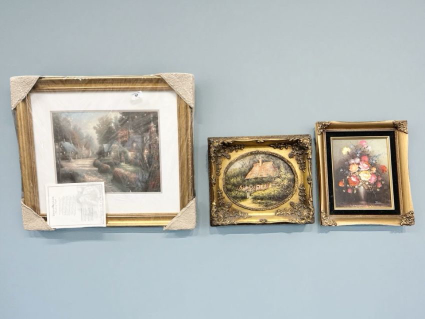 After Thomas Kinkade : Cottages in woodland, colour print, 35 cm x 28 cm, with certificate of authenticity, together with a still life oil on canvas and a further gilt-framed print. (3)
