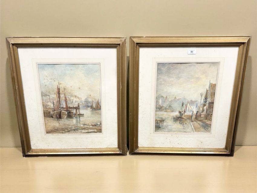 Late 19th / Early 20th Century School : Figures along a canal, watercolour, indistinctly monogrammed lower left, 36 cm x 29 cm, together with a companion piece depicting moored fishing boats. (2)