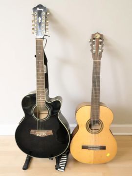 An Ibanez electro-acoustic twelve string guitar, and a further classical guitar.