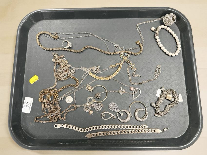 A group of jewellery items to include chains, necklaces, dress ring, earrings, white metal chains.