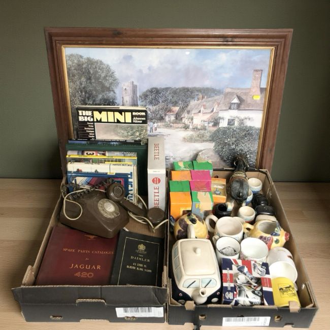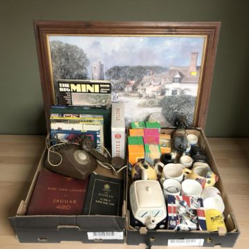 Assorted ceramics, tea pots, plastic telephone, various books, framed print, etc. (2 boxes)
