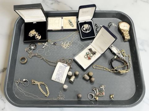 A good collection of jewellery and collectables including silver and other thimbles, costume jewellery, silver chain with pendant, Art Deco clip, silver rings, gent's Fossil watch, further gold plated chains etc.