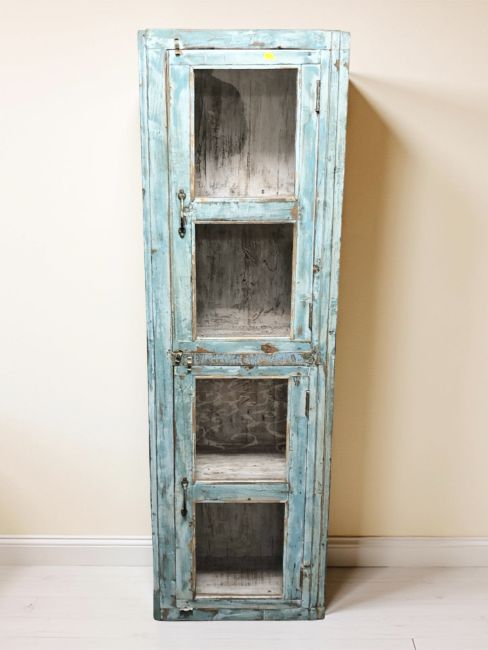 An Indian glazed double door cabinet in blue shabby-chic painted finish, 49 cm x 29 cm x 159 cm.