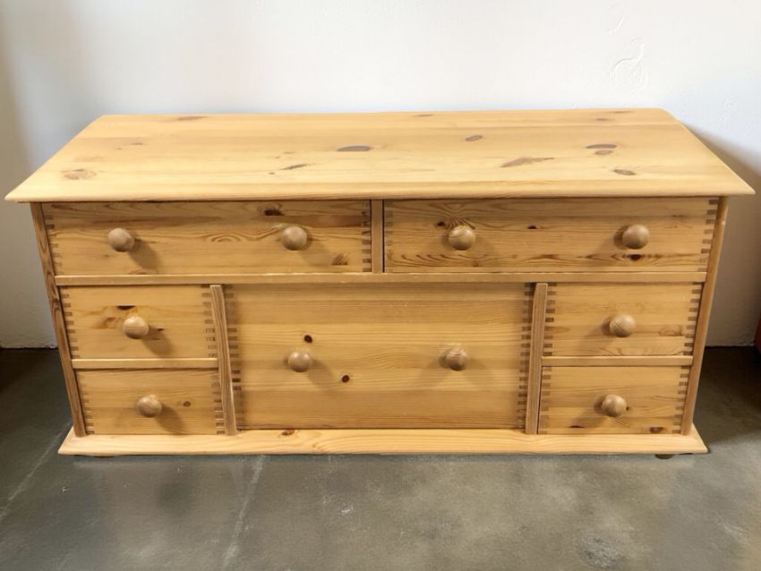 A modern pine seven drawer low chest, 112 cm x 42 cm x 53 cm.