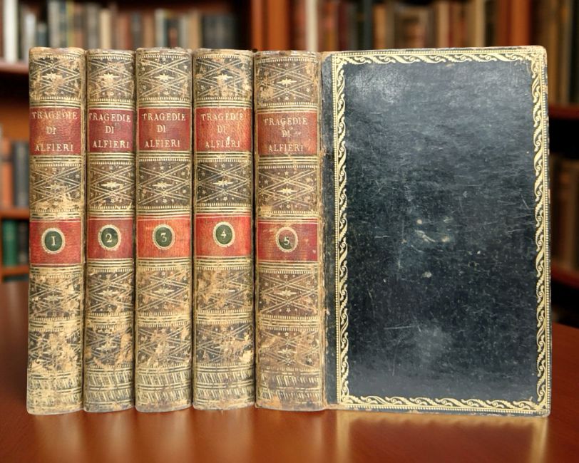 Alfieri, Vittorio : Tragedie di Vittorio Alfieri Da Asti, five volumes (missing VI) published Firenze 1803, Italian text, 12mo, full calf impressed in gilt with Burgundy titles. (5)