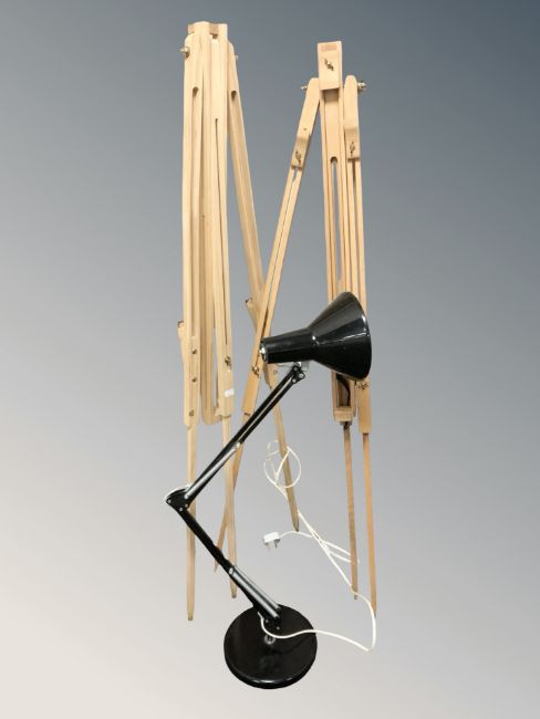 An enameled metal angle poised lamp, together with two adjustable wooden easels.