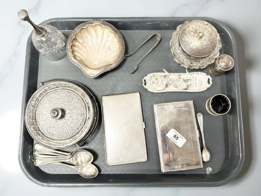 A group of silver plated and chrome plated items, miniature tea service on tray, cigarette cases etc