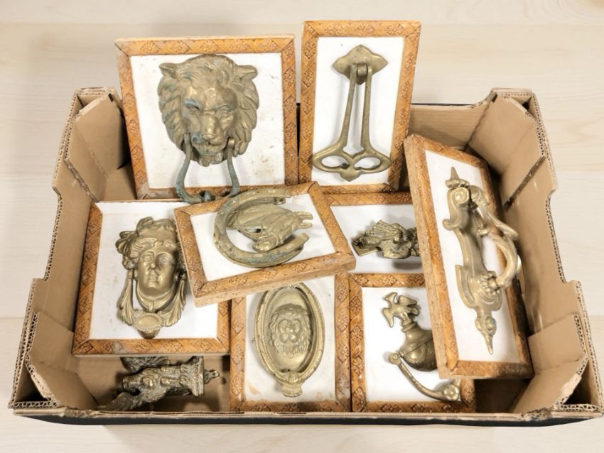 A group of cast brass door knockers mounted on boards. (1 box)