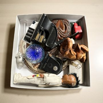 A small box of collectibles including a Swiss army pocket watch, a lorgnette, desk punch, glass paperweight, Native American style figure, etc.