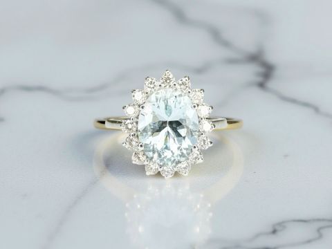 An 18ct white gold aquamarine and diamond cluster ring, size M.