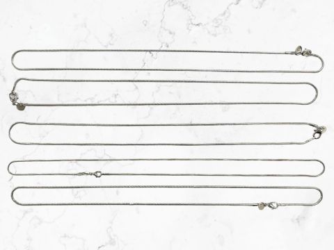 Five white metal chains each with metal disc stamped '925', each length 56 cm.
